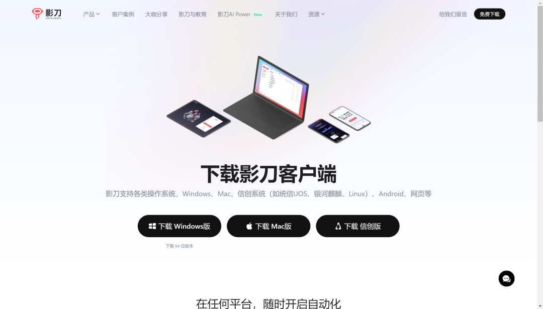 下载完成后直接在电脑上安装即可,不限盘符。安装完成后,双击桌面影刀图标,打开影刀客户端。