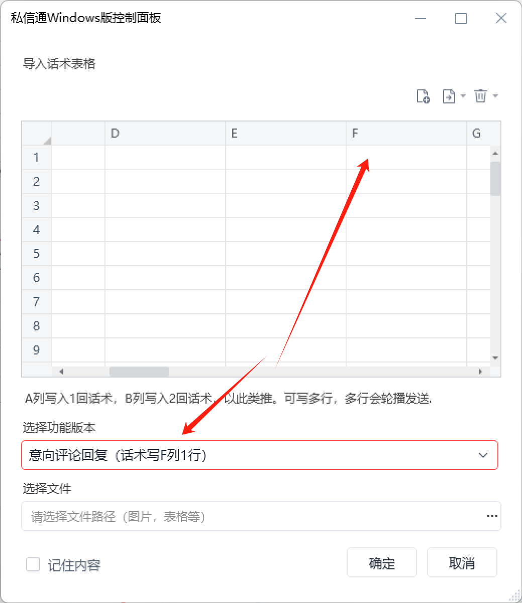 话术写A列、B列,多行可轮播(评论话术写F列1行)