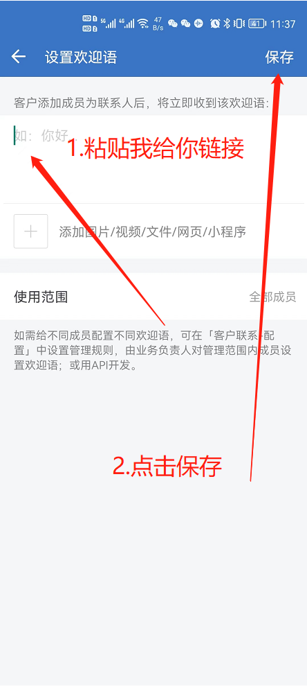 在做线下设备粉的时候,要配置欢迎语。欢迎语是由部门主管配置(如果你想全企业都使用同一个欢迎语,由总管理员配置),配置后这个部门下的成员使用同一个欢迎语。