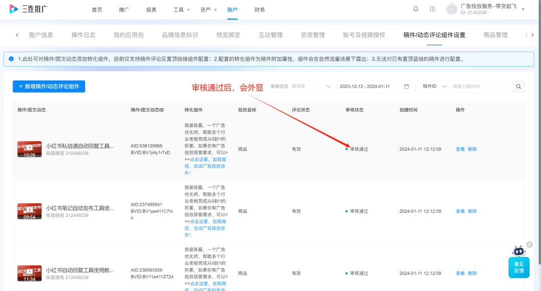 到这里基本就完成了账号绑定。如果你是采买的视频,可以通过普通视频授权,可以对那一条视频就投放推流。